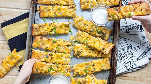 Sprinkle with remaining half of green onions. Cool slightly. Cut into about 1 1/2-inch-wide strips. Serve with additional dressing for dipping.