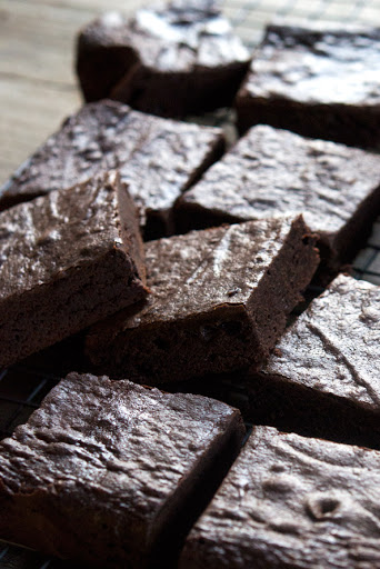 Once the chocolate mixture is no longer hot to the touch, pour the chocolate mixture into the bottom of a blender, and add all of the remaining ingredients, in the order listed. Blend until smooth. You may have to stop the blender a couple times to scrape down the sides. If you do not blend the batter, but rather just mix it with a spoon, the brownies may be a bit grainy after baking.