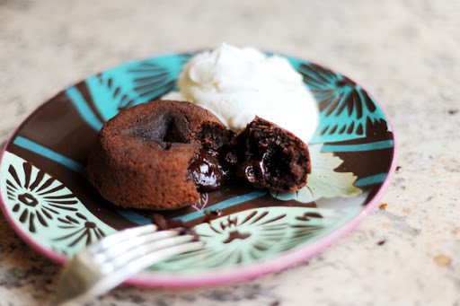 In a medium microwavable bowl, melt chocolate chips and butter in the microwave for 60 seconds and then in 30 second increments until smooth (about 1.5-2 minutes total). Add flour and sugar to chocolate/butter sauce.