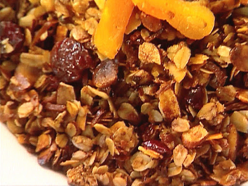 Remove the granola from the oven and allow to cool, stirring occasionally. Add the apricots, figs, cherries, cranberries, and cashews. Store the cooled granola in an airtight container.