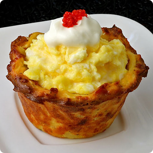 Spoon a few tablespoons of scramble eggs into each nest