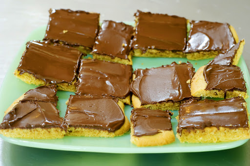 Bake for 15 to 20 minutes, or until slightly brown. At this point, pull out of the oven and sprinkle chocolate chips evenly over the top. Return to oven for 1 minute. Remove and spread melted chips over the top. Cut into squares.