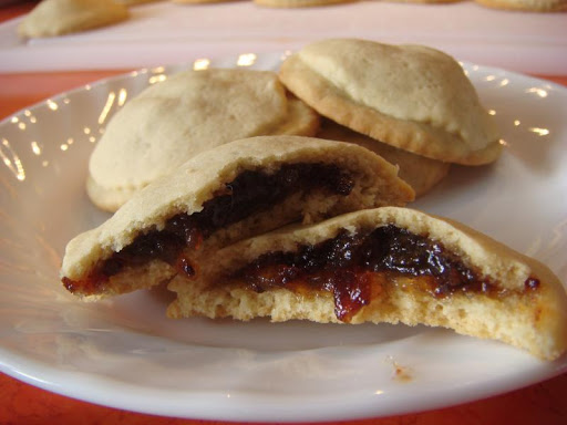 On a floured surface, roll half the dough at 1/8th inch thick. Cut with a 2 1/2" round cutter. Place about 1 tsp. date filling on each cookie. Top with another cookie; press edges down with your finger tips to seal. Baking at 375 degrees on a Silpat sheet works best for about 10 minutes.