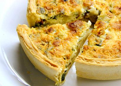 5. Bake for 30 - 40 minutes or until the quiche is lightly browned and a knife inserted 2" from edge comes out clean. Remove from the oven and let set for 10 minutes. Cut into wedges and serve.