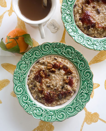 Pour in almond milk, brown sugar, cinnamon and cardamom; gently stir the mixture and cook for an additional 10 minutes. Divide the porridge between bowls, and garnish them with a handful of the Honeyed Pecans, a sprinkling of cocoa nibs, a drizzle of honey and a spoonful of your favorite jam.