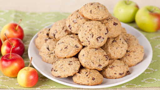 In food processor, purée together brown sugar, margarine, apple and vanilla until smooth; transfer to large bowl. Stir in flour, baking soda and salt until combined; stir in chocolate.