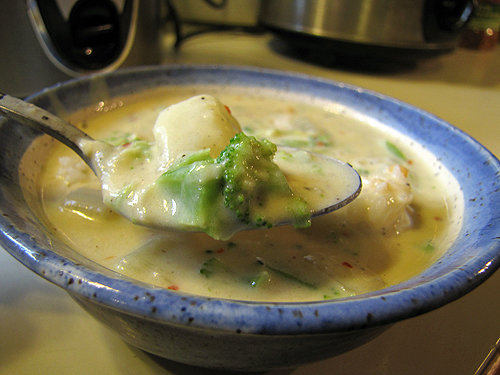 Boil the diced potatoes till soft, drain. While boiling the potatoes, I go ahead and put the frozen chopped broccoli in a medium-size slow cooker on High and start defrosting it right in the crock.