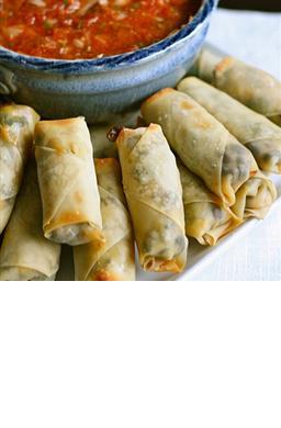 Preheat the oven to 425° F. Lightly oil a baking sheet with cooking spray. Place the sealed egg rolls on the baking sheet seam side down and spray the tops of the egg rolls with cooking spray. Bake for about 15 minutes, or until lightly brown, turning halfway through baking. Serve warm with salsa.