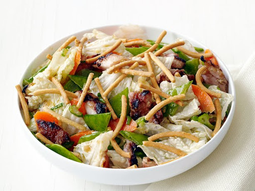 Meanwhile, toss the cabbage, carrot, scallions and snow peas with the remaining dressing in a large bowl. Cut the chicken into 1/2-inch pieces and toss with the salad. Season with salt. Top with the chow mein noodles.