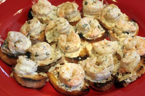 While shrimp are cooking, cut French bread into ½ inch rounds and drizzle with olive oil. Toast in an oven or broiler until crisp.