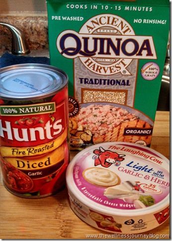 When quinoa is almost finished being cooked, add drained tomatoes and cheese wedges.