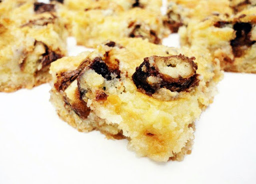 Take 10 fun sized Twix and chop each one into 5 pieces. Place them on top of the Gooey Butter Cake.