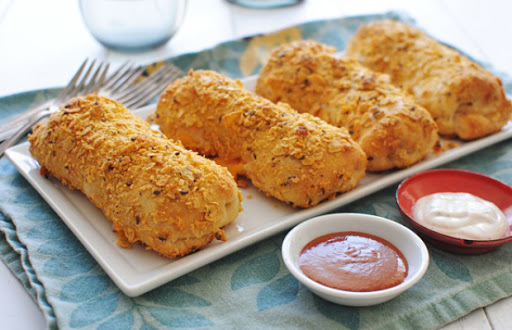 Lightly brush each rolled dog with the milk, then roll in the crushed tortilla chips.