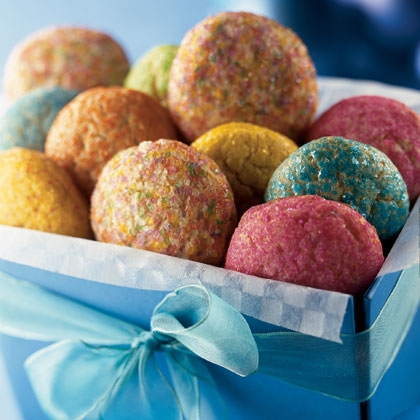 With lightly floured hands, shape the dough into 1-1/2-inch-thick balls. Roll the balls in the colored sugar and place them on the prepared baking sheets spaced about 3 inches apart. Bake the cookies on the center oven rack for 15 to 18 minutes, until they're a light golden brown. Cool the cookies on the sheet for 2 to 3 minutes. Then use a spatula to transfer them to a wire rack to finish cooling. Makes about 24 cookies.
