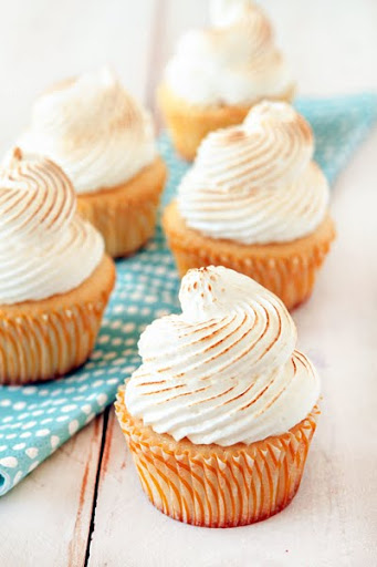 4. Frost cooled cupcakes. Use a kitchen torch to lightly brown the meringue frosting.