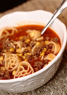 When meat is cooked through, add to beef soup mixture. Add corn and pasta and simmer for 5-10 minutes.
