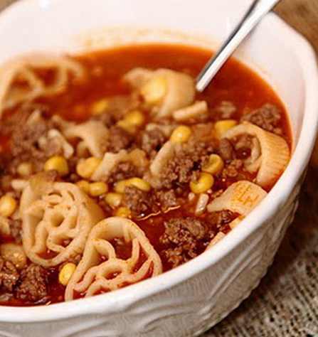 When meat is cooked through, add to beef soup mixture. Add corn and pasta and simmer for 5-10 minutes.