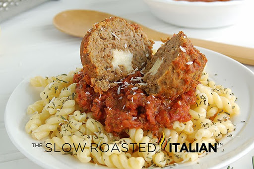 Remove from oven and place meatballs into your sauce and allow to simmer for 30 minutes. Some of your mozzarella cheese may have tried to make a run for it. Just scoop up the meatballs and cook it in the sauce.