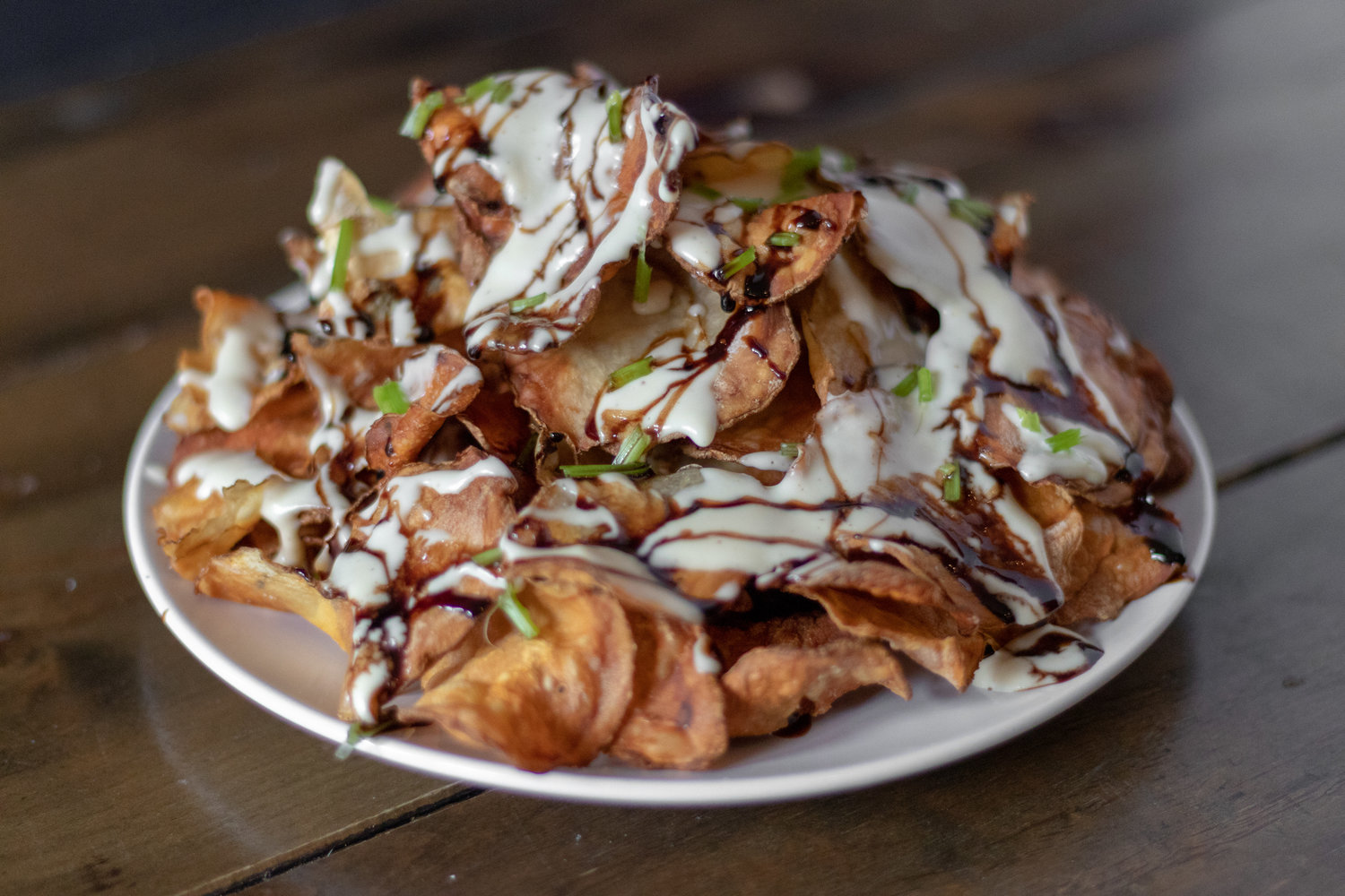 Instructions:Wash Potatoes but do not peel. Using a kitchen mandoline, slice the potatoes on the thinnest setting. You can also use your food processor with the slice attachment, or use the side of box grater that has one horizontal blade. Whatever you use, you want a super thin slice. IF USING AN AIR FRYER: Toss the potatoes in a teaspoon of oil and a few shakes of some salt, then add them in batches to your basket. Cook on 360 degrees for 15 minutes. Half way through cooking, move the chips around in the basket; they like to stick together so you may have to peel some apart. Continue cooking for another 15 minutes or until all of the slices are crisp like a chip. IF PAN FRYING: Fill a large skillet with a few inches of your preferred oil for frying. Heat the pan on medium heat until the oil is sizzling. Begin adding chips in batches and allow to cook for several minutes until they are browning and crisp. Place finished chips on a wire cooling rack that you have placed on a paper-towel-lined baking sheet. Lightly salt the chips. Add balsamic and agave to small sauce pan. Bring mixture to a boil, then reduce heat to low and allow to simmer for about 10 minutes. You can start with 1 tablespoon of agave and if the glaze is not sweet enough for you, add more. It will thicken some as it sits, so if it is too thick and sticky when you are ready to use it, add a few splashes of balsamic vinegar back in and whisk.To prepare the cheese sauce, drain the cashews and add them along with remaining cheese sauce ingredients, minus the milk and butter, to a high speed blender or food processor. Blend on high until mixture is completely smooth.Transfer mixture to a sauce pan and heat on med/low heat. Whisk the sauce as it is cooking. Once the sauce begins to thicken, add in the milk and butter, and cook for one more minute. If the sauce gets too thick, you can always add a little more milk to thin it out. To serve, pile chips on a plate. Drizzle with cheese sauce, balsamic glaze, and sprinkle with diced chives or cilantro.serves 4-6