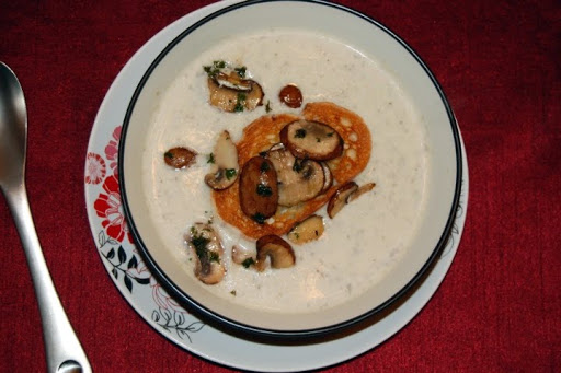 Heat 2 Tbsp olive oil over medium heat and add mushrooms until golden brown, about8 minutes. Transfer to bowl. Add 1 Tbsp of oil and cook leeks, stirring about 2 minutes. Stir in cauliflower and 5 cups water. Simmer 20 minutes. Puree in blender in batches until smooth. Return to soup pot with mushrooms and Parmesan cheese. Season to taste and add salt and pepper to taste. Drizzle with olive oil