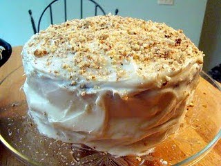 Assembly: Place 1st layer of cake on serving plate. Top with 1/4 of the frosting and smooth evenly. Top with second layer. Smooth on remaining frosting. Garnish with pecans.