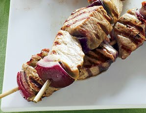 Heat grill to medium heat. Thread skewers with 4 pieces of pork, alternating with onion. Put tomatoes in grill pan. Grill both, turning occasionally about 4 minutes for tomatoes and 12-15 minutes for kebabs.