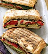 3.Arrange the vegetables on the bread loaf bottom and top with the cheese and arugula. Spread the bread top with the tapenade and set in place. Place the sandwich on the grill and cover with 2 bricks covered in foil or place in a skillet piled with heavy cans. Press the sandwich until crisp on top, about 2 minutes. Flip and repeat. Cut into 4 portions.