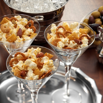 Combine popcorn, cereal, pretzels and nuts in large bowl.