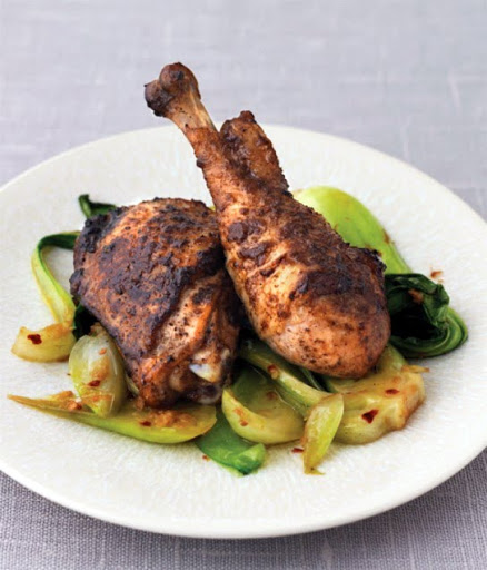 Meanwhile, wipe out the frying pan with paper towels, reduce the heat slightly, and add the greens. Drizzle in the remaining 1 tbsp oil, and stir-fry for about 5 minutes until beginning to wilt. Serve hot with the crispy-skinned chicken.