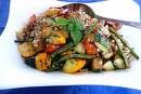 Preheat grill pan. Coat vegetables with olive oil spray. grill vegetables until charred and tender, about 10-12 minutes. Cut zucchini and bell peppers into bite size chunks. Place cooked vegetables in bowl and sprinkle with salt, pepper and chives. Store for up to 4 days in frig.