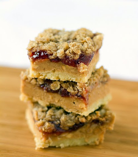 9. Assemble the Bars: Spread the jelly in an even layer over the peanut butter filling. Sprinkle on the crumb topping, covering the jelly.