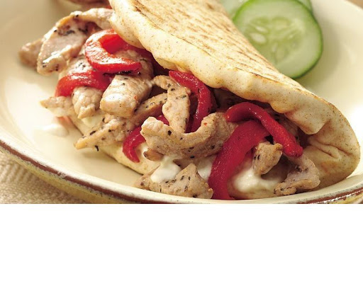 Thinly sliced chicken can be substituted for the pork in this recipe. Cook 5 to 6 minutes or until the chicken is no longer pink in center. Look for flavored and whole wheat pita breads in the bakery section of the supermarket to use instead of the pita folds.