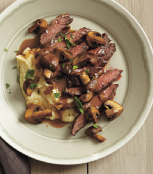 Serve the steak with the cauliflower puree. Top with the mushroom sauce and sprinkle with the parsley.