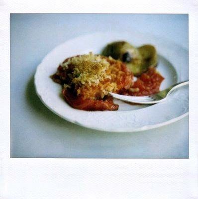 Spoon the par-cooked rice mixture into the tomatoes. Top them with a sprinkling of breadcrumbs. Arrange the potato slices around the tomatoes in the pan. Give everything a good drizzle of olive oil. (You might want to flip and rub the potatoes a bit, to make sure that each has a nice coat of oil.) Bake for 1 hour and 15 minutes. The tomatoes should shrivel a bit and release some of their juices, and the potatoes should cook through.