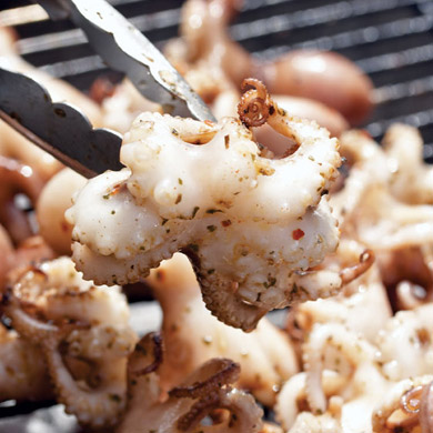 The technique you use for grilling squid is the same as for whole baby octopus or cut-up octopus tentacles. You want to marinate them first to imbue them with flavor. Squid and octopus are not as delicate as fish, so you can marinate them longer—ideally, for 3 to 4 hours. Then, grill them quickly on an oiled, perforated grill rack (so they don't fall through the grill grates) over a hot fire; that way, they crisp up without getting rubbery.