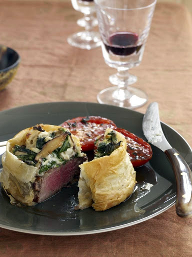 Transfer the wrapped beef to a roasting pan and bake in the oven for 30 minutes. If the filo tops seem to be browning too early, place a piece of foil over them and keep covered until the meat is fully cooked. Remove from the oven and let the filets rest for 2 minutes before serving.