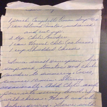 In a small saucepan, heat soup mix, tomatoes and chili powder to simmering. Cover, simmer 10 min. Stirring occasionally. Add Chili and pour into serving bowl. Sprinkle with cheeses. Heat and stir before serving. Serve with chips.