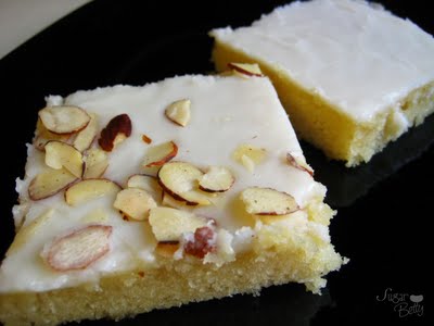 I was surprised to find a recipe for white Texas sheet cake. Texas sheet cake is known for that heavenly layer of "fudgeyness" where warm frosting and warm cake get together and do a little dance. This blonde version includes that same fudgey layer. The icing is shiny, it sets up like fudge but is soft on the bottom and slightly flaky on the top. This white sheet cake won't disappoint. It has a mild almond flavor and can be served with or without nuts. The buttermilk in this cake keeps the cake really tender, while also adding a slightly tangy flavor.