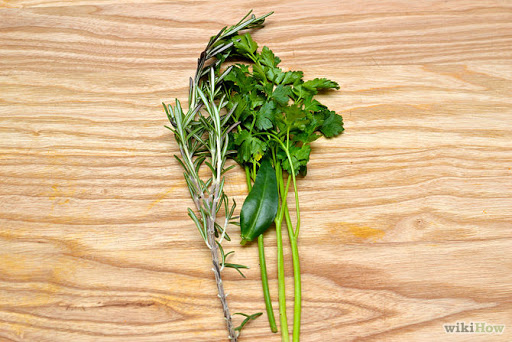 - 1 Gather together fresh herbs,black peppercorns making sure they have long stems. For a traditional bouquet garni, the herbs should consist of 3 sprigs of parsley, 2 sprigs of thyme and 1 bay leaf.