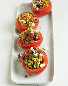 Add scallions, all but 2 tablespoons goat cheese, vinegar, and oil. Season with salt and pepper; toss to combine. Spoon filling into hollowed tomatoes; sprinkle with remaining goat cheese and, if desired, bacon.