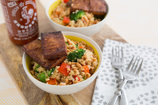 2. Whisk the peanut butter, lime juice, water, tamari, sugar, and ginger in a small bowl. When the quinoa is done, transfer it to the bowl with the veggies and toss everything with the peanut sauce. Season with salt and pepper to taste. Divide the quinoa into 2 bowls, then top each with 2 slices of tofu and a tablespoon of chopped peanuts.