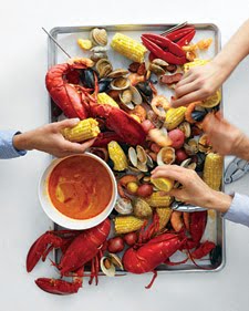 2.Remove seafood, corn, potatoes, and chorizo using tongs, and transfer to large platters or rimmed baking sheets. Discard seaweed and any unopened clams and mussels. Strain liquid through a sieve into a bowl; add butter, swirling to melt. Squeeze lemons over clambake.