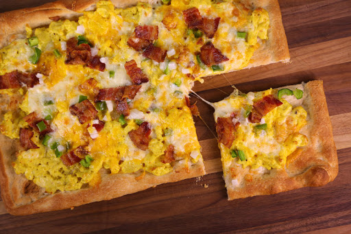 Roll out pizza crust onto a greased 15 x 10 x 1 baking sheet. Flatten dough & pinch up edges slightly. Brush with 1 TB olive oil. Prick dough with a fork & bake at 400 for 6 minutes or until lightly browned. Meanwhile, whisk eggs, water, & hot sauce. In a small skillet, heat remaining oil & add eggs. Cook & stir over medium heat until completely set. Spoon eggs over crust, season with salt & pepper, then top with cheeses. Add peppers & onions, if using. Top with meats. Bake for 7 minutes, or until cheese is melted.