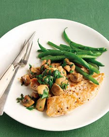 Place mushrooms and 1 tablespoon butter in skillet; season with salt and pepper. Cook, stirring occasionally, until mushrooms are tender, about 7 minutes. Remove from heat, and stir in remaining 2 tablespoons butter, lemon juice, and parsley. Top chicken with mushrooms, and serve with green beans alongside.