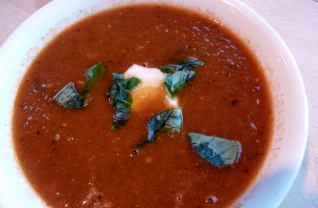 Add stock or water and bring to a boil. Reduce heat and simmer for about 10 minutes. Puree using an immersion blender. Test for salt and pepper. Ladle soup into a bowl, add sour cream if using, and add basil.