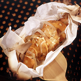 For each portion tear aluminum foil into a 12 inch square piece. Line with a similar sized piece of parchment.