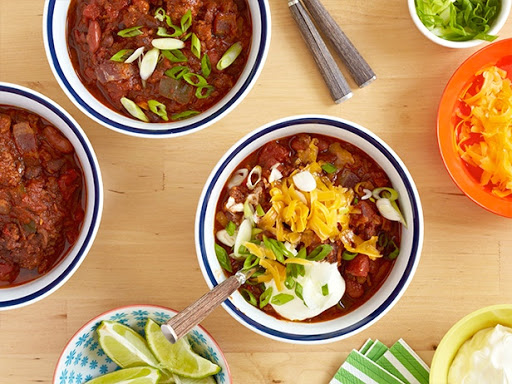 Taste for seasoning and add salt and pepper, if necessary. Transfer the chili to serving bowls and garnish with lime wedges, sour cream, shredded cheese, and sliced scallions