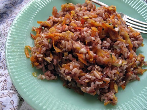 I whipped this up after work one night recently in an effort to put the lingering veggies in our fridge to good use, and to give the chicken that Josh was roasting some company. It was so delicious that I will surely make it again. I served it with a bit of tahini sauce from Trader Joes, though it's extremely flavorful all on it's own—the sauce mostly adds a bigger hit of garlic. It makes an excellent side dish if you like to have a protein with your dinner (like Josh often does), or a fantastic vegetarian main dish (which is usually how I lean). You could also add a handful of walnuts, cooked white beans, or some feta if you want to up the non-meat protein. This rice dish is a nice reminder that whole grains can be extremely comforting, regardless of the season.