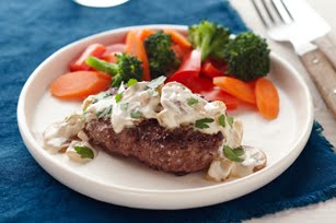 Mix meat and pepper; shape into 4 (½-inch thick) oval patties. Melt 1 teaspoon butter in large skillet on medium heat. Add patties; cook 5 minutes on each side or until done (160ºF). Transfer to platter; cover to keep warm. Melt remaining butter in same skillet. Add mushrooms and onions; cook and stir 3 minutes. Stir in Worcestershire sauce; cook and stir 2 minutes or until onions are crisp-tender. Add cooking creme; cook 2 to 3 minutes or until heated through, stirring frequently. Spoon over patties; top with parsley.