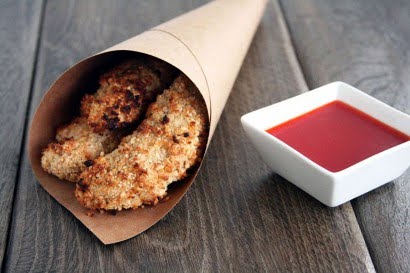 For the chicken tenders, preheat oven to 400ºF. Take a rimmed baking sheet and set a cookie cooling rack inside of it. Spray with non-stick spray. Set up an assembly line of 3 baking dishes. In the first dish, mix together flour, salt, garlic powder, pepper, and cayenne. In the second dish, pour the buttermilk. Finally, in the third dish, mix together the Panko and the cashew crumbs.